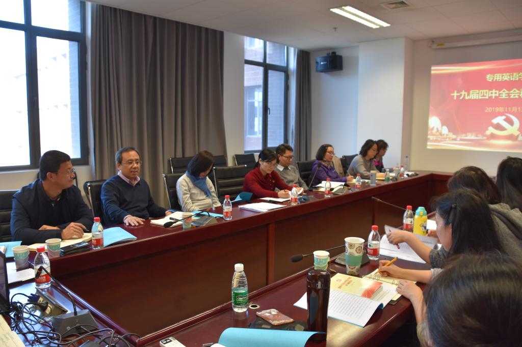 蔡鸿结合《决定》中的要点谈了自己的学习体会,认为《决定》中“科学制度”内涵丰富、意义深远,并结合“构建服务全民终身学习的教育体系”和“推进合作共赢的开放体系建设”两部分内容,谈了立德树人体制机制、高科技支撑的现代化教育、“一带一路”战略对新时代英语教育教学要求的认识,以及学院在助力促进学校平稳较快发展,培养具有中国情怀、国际视野、思辨能力和跨文化能力的复合型、复语型、高层次国际化人才过程中应发挥的作用。